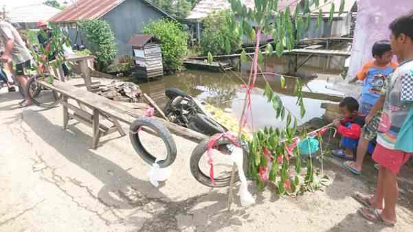 Jatuhnya truk itu karena balok Ulin ukuran 20 x 20 cm patah di tengah jembatan sebelah kanam arah masuk. Hal tentu saja menjadi tonton warga karena di atas jembatan di pasang pagar dari bangku panjang dan tanaman karena hancur.