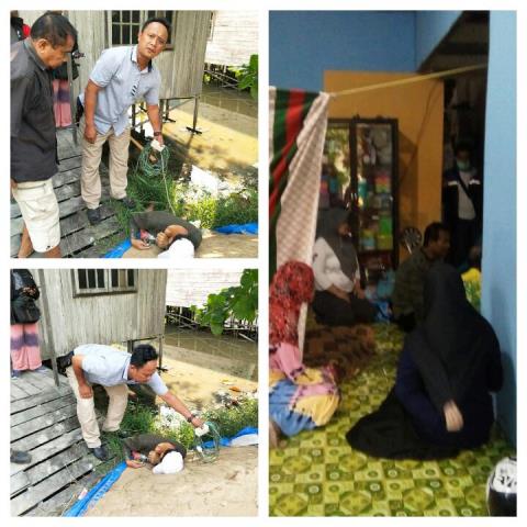 Saat ditemukan ayah dua anak itu kakinya menyentuh air kolong tempat dia mau memperkuat tiang rumah alias Suai. Sementara tali kabel lsitrik untuk alat bor juga ada di sampingnya di luar rumah milik Nur Sa’adah (50) seorang guru SMP warga Pagatan Kabupaten Tanah Bumbu.