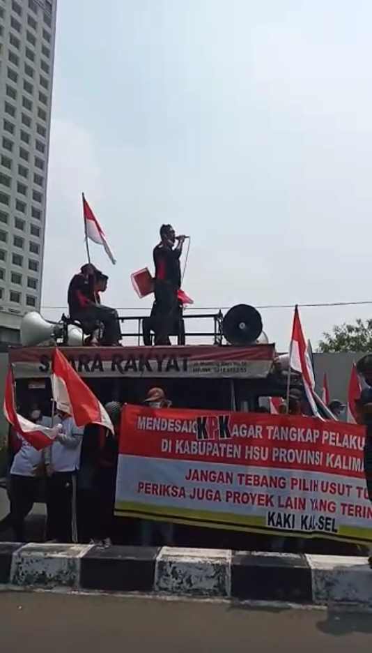 Mengenakan kaos hitam bertuliskan KAKI serta emblem merah putih di lengan kiri kanan kaos dalam orasinya selain mendesak KPK menangkap Bupati HSU, pria yang akrab disapa Usai ini juga menyampaikan sejumlah dugaan penyimpangan terkait dugaan jual beli jabatan ASN di Kabupaten HSU .