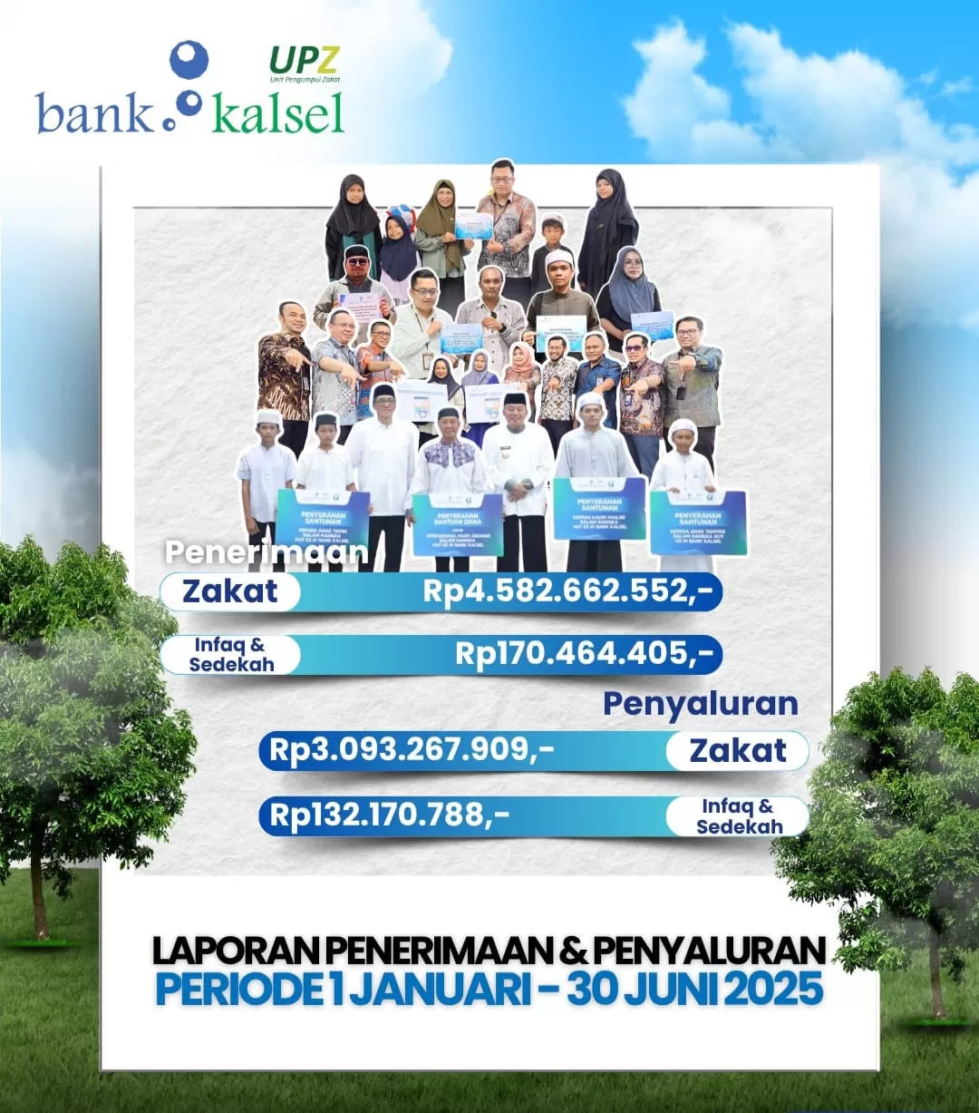Banjarmasin, BARITOPOST.CO.ID – Zakat melalui UPZ Bank Kalsel telah menghimpun Rp4.582.662.552, dan infaq dan sedekah sebesar Rp170.464.405, terhitung 1 Januari – 30 Juni 2025.