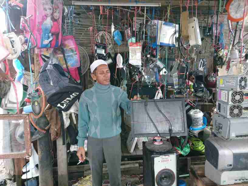 “Awalnya usaha saya ini Agustus lalu bermula dari petunjuk, kemudian tukang gerobak sampah menjual barang itu. Dulu kalau narang elektronik sempat diperbaiki anak buah saya, tap sekarang tidak ada lagi orangnya,”bebernya usai mencuci tangan pakai sabun dengan air sabun saat melayani pembeli.