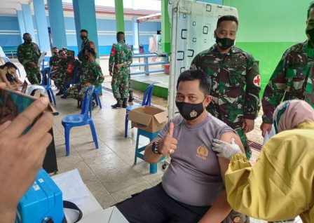 Kapolsek Alabio Iptu Agus Sumitro yang mendapat giliran pertama Vaksinasi memotifasi warga agar tidak ragu dan tidak takut di Vaksinasi Covid-19.