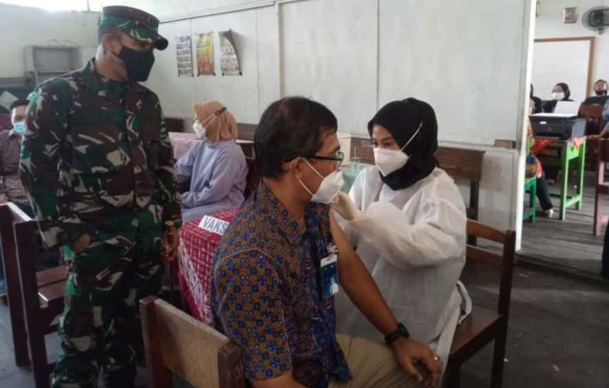 Banjarmasin, BARITO – Serbuan vaksinasi mobile dari Komando Distrik Militer (Kodim) 1007/Banjarmasin menyasar wilayah pinggiran, Kamis, (26/8/21). Vaksinasi jenis Sinovac pertama itu dipusatkan di halaman Sekolah Dasar Negeri (SDN) Meranti dengan target warga kawasan Jalan Mantuil Permai RT 13 RW. 02, Kelurahan Mantuil, Kecamatan Banjarmasin Selatan.
