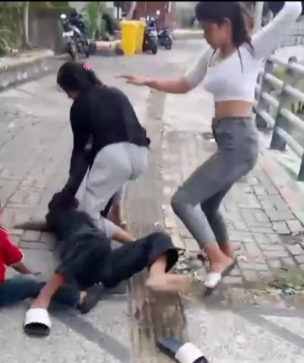 dua orang perempuan mengeroyok seorang remaja perempuan di area Siring Kelurahan Kemuning Kota Banjarbaru, Senin (1/7/2024).