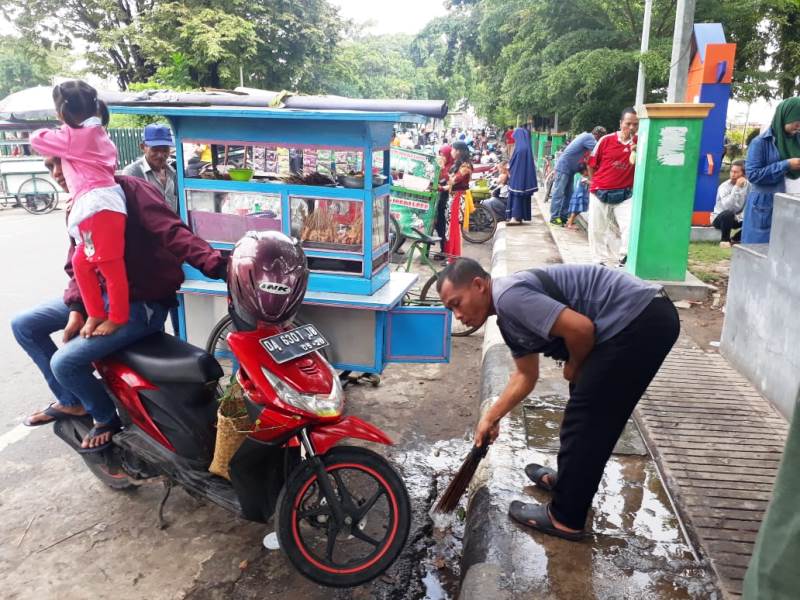 PAMAN PENTOL- penjual pentol di depan Nol Kilometer Jalan Panglima Sudirman sigap membersihkan sampah bekas dagangannya. (foto: anangfadhilah)