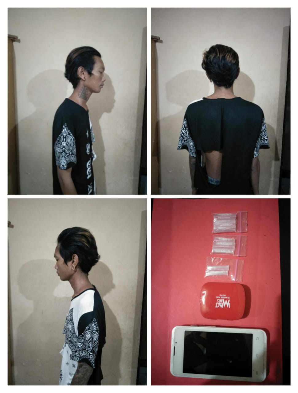 Polisi akhirnya berhasil menemukan barang bukti (Barbuk) sebanyak 12 paket kecil Narkotika jenis Sabu-sabu bersih sekitar 0,48 Gram. Selain itu juga satu handpone merk Evercross warna putih dan satu kotak permen warna Merah Merk Impact turut disita.