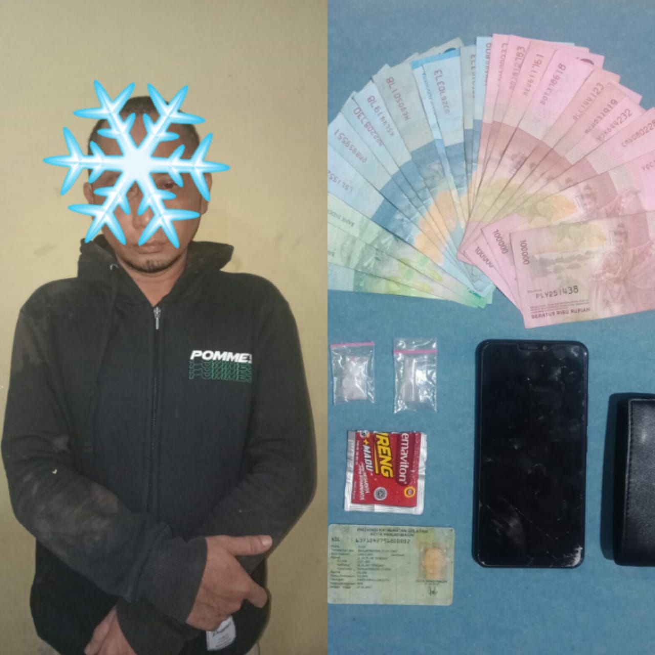 Anggota opsnal Polsek Banjarmasin Utara kemudian melakukan penangkapan serta penggeledahan badan terhadap pelaku. Dari hasil pengeledahan badan pelaku ditemukan satu kotak rokok Gudang Garam yang berisi 1 paket Narkotika jenis sabu-sabu.