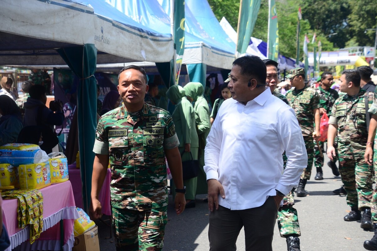 Warga dan Prajurit TNI tampak antusias menyerbu Bazar yang menjual berbagai macam makanan, minuman, pakaian dan sembako.