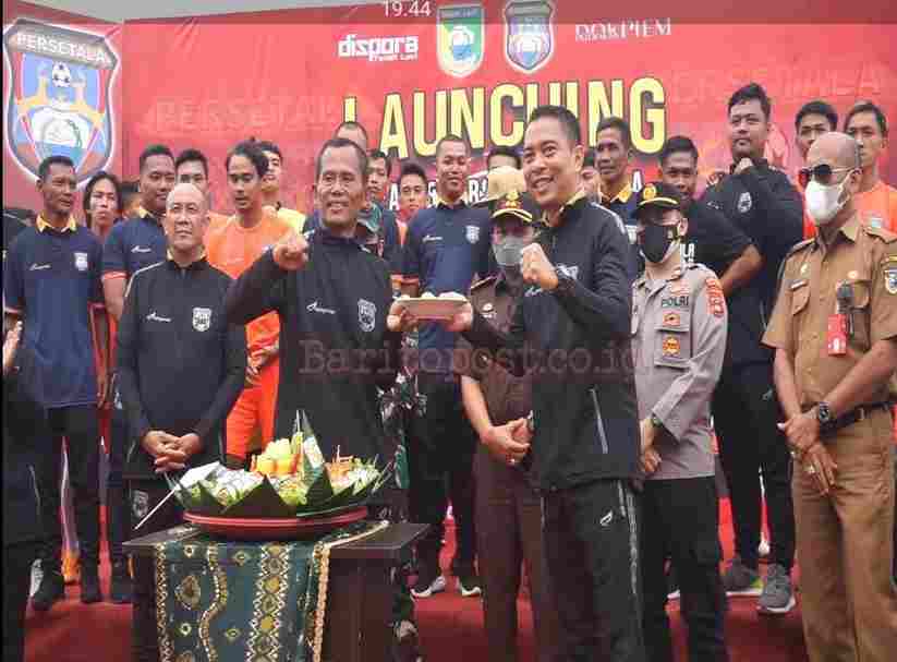 Pelaihari,BARITO – Tim sepak bola Persetala Kabupaten Tanah Laut kini tampil dengan kostum Jersey baru warna oranye. Selasa, (26/10/21) sore di Stadion Pertasi Kencana Pelaihari, Lounching Jersey baru ditandai dengan pemotongan nasi tumpeng oleh Bupati Tanah Laut HM.Sukamta, dan selanjutnya menyerahkan potongan nasi tumpeng kepada Manajer Persetala Kompol Fauzan Arianto.