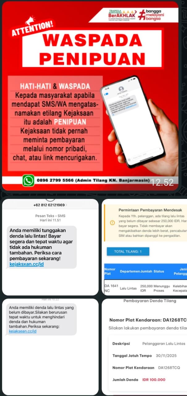 Banjarmasin, BARITOPOST.CO.ID – Masyarakat diminta waspada terhadap modus penipuan tilang motor melalui pesan Short Message Service (SMS) yang belakangan beredar, Senin (1/12/2025). Meski demikian, sejauh ini belum ada korban yang melapor ke Satlantas Polresta Banjarmasin maupun pihak kejaksaan.