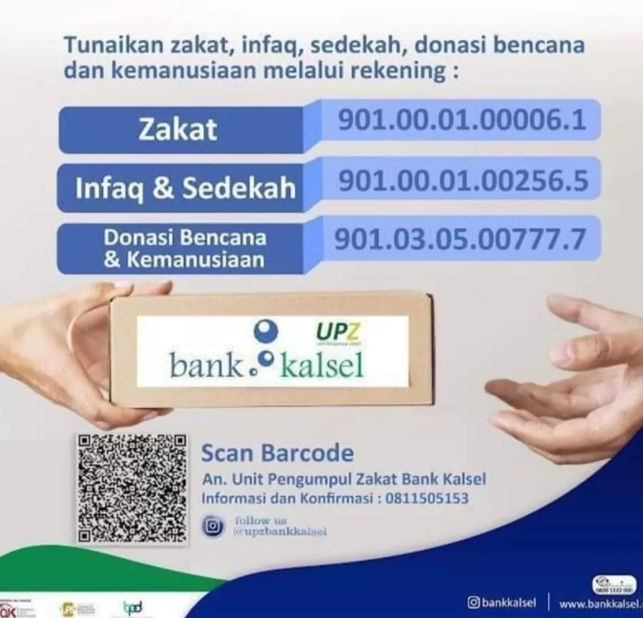 Sebagai informasi, saluran bantuan melalui rekening UPZ Bank Kalsel antara lain untuk pembayaran zakat di no. rek 901.00.01.00006.1 a/n UPZ Bank Kalsel, lalu untuk infaq dan sedekah di no. rek 901.00.01.00256.5 a/n UPZ Bank Kalsel dan untuk donasi bencana dan kemanusiaan di no. rek 901.03.05.00777.7 a/n UPZ Bank Kalsel.